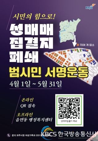 한국방송통신사 관리자 기자 | 파주시는 4월부터 5월 31일까지 성매매 집결지 즉각 폐쇄를 위한 범시민 서명운동에 돌입했다고 밝혔다.