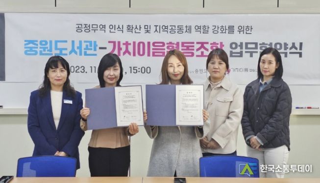 한국소통투데이 관리자 기자 | 성남도시개발공사 산하 중원도서관은 공정무역 인식 확산 및 지역공동체 활성화를 위해 가치이음협동조합과 업무협약을 체결했다고 13일 밝혔다.