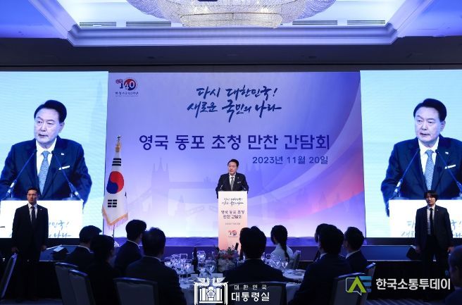 한국소통투데이 관리자 기자 | 찰스 3세 영국 국왕의 초청으로 영국을 국빈 방문 중인 윤석열 대통령은 김건희 여사와 함께 오늘(현지시각 11. 20, 월) 오후 현지 동포를 초청하여 만찬을 겸한 간담회를 했다. 이번 간담회는 영국 전역에서 활발히 활동 중인 200여 명의 동포들이 참석한 가운데 진행됐다.