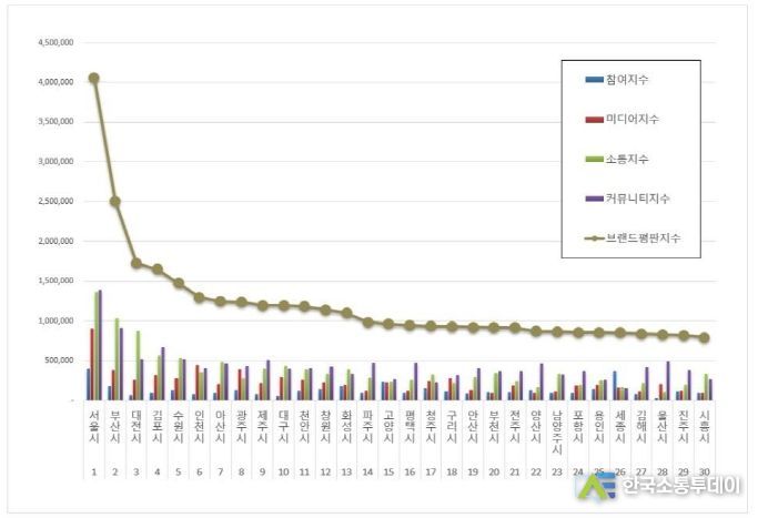 이번 2월 조사에서 대전시는 참여지수 66,684, 미디어지수 264,692, 소통지수 872,974, 커뮤니티지수 518,033이 되면서 브랜드평판지수는 종합 1,722,382로 분석되어 3위에 선정됐다.