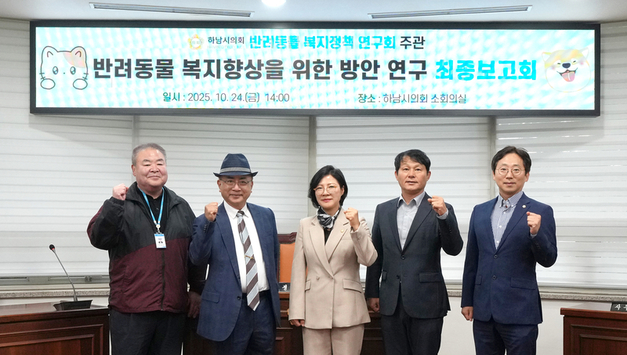 [한국소통투데이=신경수 기자] 하남시의회 의원연구단체 ‘반려동물 복지정책 연구회(대표의원 정혜영)’는 23일 오전 10시 의회 소회의실에서 연구용역 중간보고회를 개최했다. 하남시의회에 따르면 이날 ‘하남시 반려동물 복지 향상을 위한 법·제도적 방안 마련 연구용역’ 중간보고회에는 정혜영 대표의원을 비롯해 부대표 정병용, 강성삼, 오승철 의원 등 연구단체 소속 의원과 제윤의정 연구진이 참석해 연구 진행 경과와 중간 성과를 공유하고 다양한 의견을 나눴다. 이번 연구용역은 1500만 ‘펫팸족(Pet+Family) 시대’를 맞아 반려동물 양육 가구 증가, 유기 동물 문제 심화, 동물보호법 강화 등 변화하는 사회적 환경에 대응해 하남시 실정에 맞는 제도적 기반과 정책 체계를 마련하기 위해 추진됐다. 연구진에 따르면 현재 하남시에는 반려동물 관련 조례가 존재하나, 실효성 있는 복지정책으로 연계되지 못하는 실정으로 전담 부서 및 전문 인력 부재, 조례 내 실질적 실행 수단 부족으로 행정의 연속성과 전문성이 미흡한 것으로 지적됐다. 또 예산 편성과 운영 체계가 제한적이며, 민간단체와의 협력 구조도 체계적이지 않아 타 지자체 대비 제도적 기반이 취약한 것으로 조사돼 하남시 실