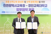 (한국소통투데이 통신사=김동현 기자) 인천광역시교육청(교육감 도성훈)은 12일 초등 수학교육을 활성화하고 수학 문화를 확산하기 위해 경인교육대학교와 업무협약을 체결했다고 밝혔다. 이번 협약을 통해 두 기관은 ▲‘쉬운 수학, 즐거운 수학’ 교구·교재 보완자료 개발 자문 ▲수학교육 문화 확산을 위한 학교 지원 프로그램 운영 ▲수학교육 관련 학술교류 및 공동 연구 추진 ▲초등교원의 수학교육 전문성 강화를 위한 연수 지원 등 다양한 분야에서 협력하기로 했다. 시교육청은 이미 지난 6월부터 경인교육대학교 산학협력단 산하 수학교육문화연구원과 협업해 초등 3~6학년을 대상으로 하는 ‘이중수직선’, ‘움직이는 도형판’ 등 교구 2종과 교재 6종을 개발하고 있으며, 오는 11월 4주에는 교원의 희망 신청을 받아 자료를 보급하고 활용 워크숍을 진행할 예정이다. 인천시교육청 관계자는 “학교 현장의 의견을 반영해 초등 수학교육의 혁신적 성장과 질적 향상을 위한 협력 기반을 마련했다”며 “학생들이 수학적 탐구심을 기르고 자기주도적으로 학습할 수 있도록 지속적으로 협력해 나가겠다”고 말했다.
