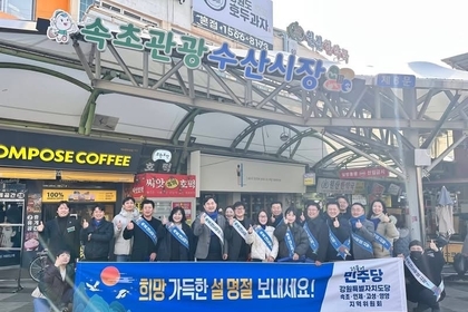 제수용품 구입하며 상인들과 새해 인사… “북적이는 민생 현장에 답이 있다” /감자옹심이 점심 함께하며 소통 행보… “풍성하고 행복한 연휴 되길” 민족 최대의 명절인 설을 맞아 속초의 민생 현장이 정치권의 활발한 소통 행보로 온기를 더했다. 김도균 더불어민주당 강원도당위원장은 설 연휴를 앞둔 지난 13일, 전국 최고의 활력을 자랑하는 ‘속초 관광수산시장(중앙시장)’을 찾아 당원들과 함께 풍성한 장보기 행사를 가졌다. ■ 전국 1등 시장의 활기… 상인·관광객과 함께한 ‘민생 투어’이날 김 위원장과 당원들은 이른 오전부터 시장을 방문해 제수용품을 직접 구입하며 대목을 맞은 상인들의 애로사항을 청취했다. 속초 관광수산시장은 전국 전통시장 중 최상위 수준의 방문객 수를 자랑하는 명소답게, 평일 오전임에도 불구하고 전국 각지에서 온 관광객과 지역 주민들로 발 디딜 틈 없이 붐볐다. 김 위원장은 시장 구석구석을 누비며 상인들과 일일이 손을 맞잡고 새해 인사를 건넸다. 그는 “활기차게 북적이는 시장의 모습에서 속초 경제의 저력을 느낀다”며 “전국 1등 시장의 위상에 걸맞게 더 많은 이들이 편안하게 찾을 수 있는 전통시장 환경을 만드는 데 도당 차원의 정책적 지원을 아끼지