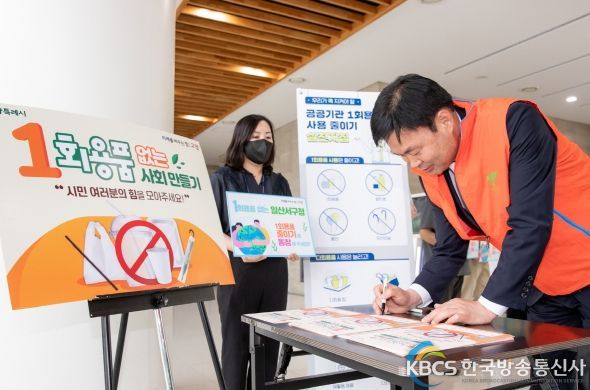 한국방송통신사 관리자 기자 | 고양특례시 일산서구는 지난 22일 전 직원의 1회용품을 줄이기를 위한 자발적인 노력을 독려하고, 공공기관으로서 기후변화 위기 상황 대응과 탄소중립의 중요성을 인식·실천하는 계기를 만들고자 ‘1회용품 없는 날’ 홍보 캠페인을 전개했다.