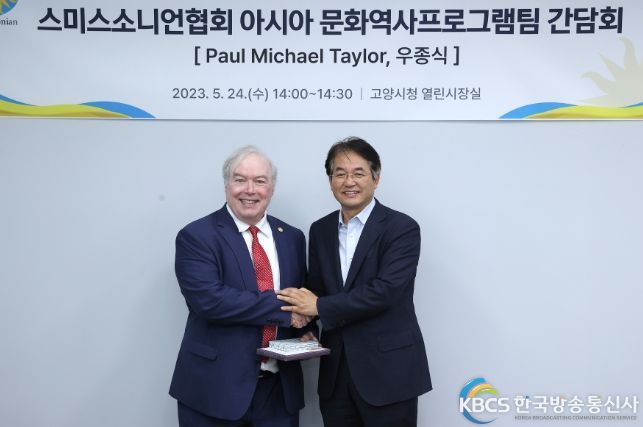 한국방송통신사 관리자 기자 | 이동환 고양특례시장이 5월 24일 고양시청에서 스미스소니언재단(Smithsonian Institution)의 폴 마이클 테일러(Paul Michael Taylor) 국장과 우종식 컨트리뷰터 등 아시아 문화역사프로그램팀 관계자, EBS미디어 박성호 대표와 간담회를 가졌다.