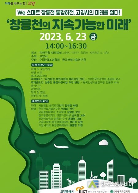 고양시가 주최하고 한국건설기술연구원과 사단법인 한국조경학회가 공동 주관하는 이번 학술 토론회는 주제발표 및 종합토론으로 진행된다. 1부에서는 ▲하천환경 복원사업의 패러다임 변화(한국조경학회 송병화 교수) ▲창릉천 통합하천사업 추진방향(한국건설기술연구원, 안홍규 연구위원)에 대한 주제발표가 있을 예정이다.