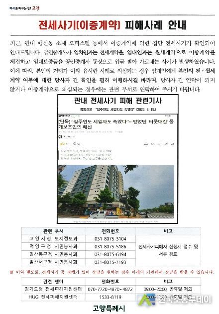 한국소통투데이 관리자 기자 | 고양특례시는 최근 관내 행신동 소재 오피스텔에서 발생한 이중계약에 따른 집단 전세사기와 관련하여 전세사기 예방을 위한 신고 창구를 개설했다고 16일 밝혔다.