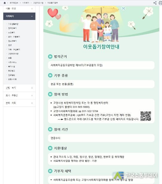 한국소통투데이 관리자 기자 | 고양특례시는 고양시 기부 나눔 문화 확산을 위해 사회복지공동모금회 경기북부지회와 함께 고양시청 홈페이지에 큐알코드 간편기부시스템을 개설했다.