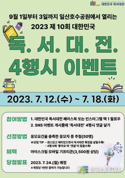 시는 독서대전의 특징을 잘 살린 4행시 중 총 50명을 선정하여 모바일 상품권을 증정할 예정이다. 이벤트 당첨자는 7월 24일 독서대전 공식 홈페이지와 인스타그램, 페이스북에 공지될 예정이다.