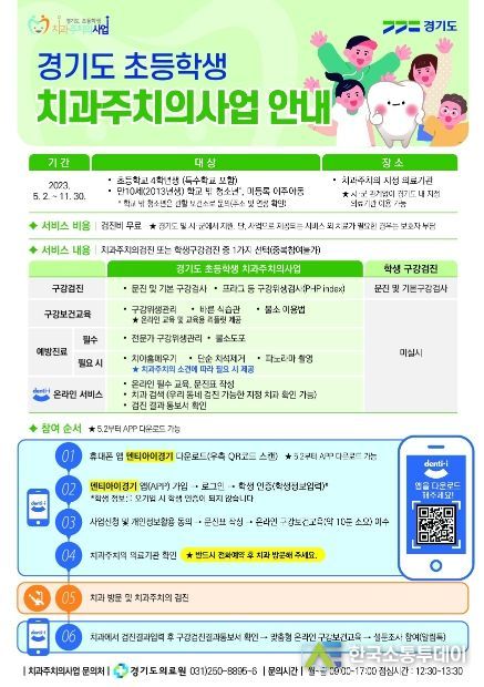 참여 방법은 ‘덴티아이경기’ 앱에 가입하여 사전 문진표 작성과 온라인 구강보건교육을 마친 뒤 희망하는 치과주치의 지정 의료기관에 전화 예약 후 방문하면 된다. 치과주치의 지정 의료기관은 고양시 보건소 홈페이지 및 ‘덴티아이경기’ 앱에서 확인할 수 있다.