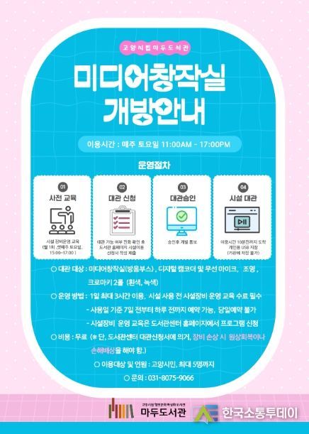 한국소통투데이 관리자 기자 | 고양특례시 마두도서관은 이달부터 ‘미디어창작실’을 시민에게 개방해 운영한다. 미디어창작실은 매주 토요일 오전 11시부터 오후 5시까지 운영한다. 이용자가 사전에 대관신청을 하면 하루 최대 3시간까지 이용할 수 있다.
