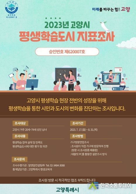 한국소통투데이 관리자 기자 | 고양특례시에서 오는 7월 14일부터 8월 31일까지 고양시에 거주하는 20~74세 성인 2,000명을 대상으로 ‘고양시 평생학습도시 지표조사’를 처음으로 실시한다. 조사 결과는 12월 중에 공표될 예정이다.