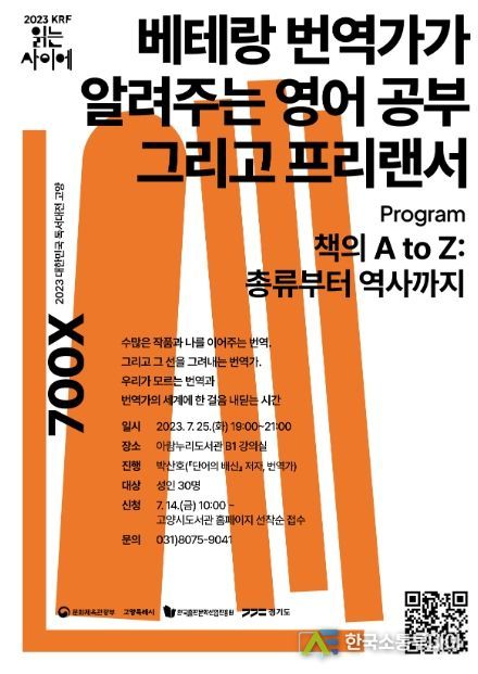 한국소통투데이 관리자 기자 | 고양특례시 아람누리도서관은 오는 7월 25일 저녁 7시에 박산호 번역가를 초청해 ‘베테랑 번역가가 알려주는 영어공부 그리고 프리랜서’ 강연을 운영한다.