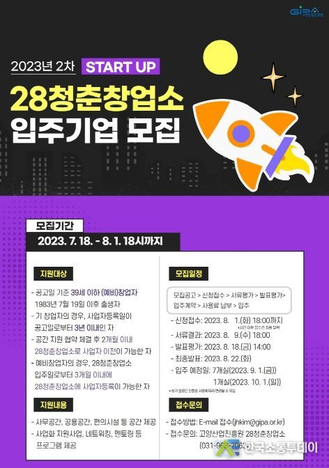 한국소통투데이 관리자 기자 | 고양시가 조성하고 고양산업진흥원이 운영하는 청년창업 지원시설 28청춘창업소가 신규 입주기업을 모집한다.