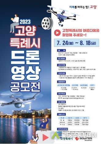 한국소통투데이 관리자 기자 | 고양특례시가 7월 24일부터 8월 18일까지 2023 고양시 드론영상 공모전을 개최한다. 시는 ‘드론으로 고양특례시 명소를 찾아라’라는 주제로 고양시의 아름다운 자연경관, 지역명소, 숨은 관광지 등을 담은 드론 영상과 사진을 접수받는다.