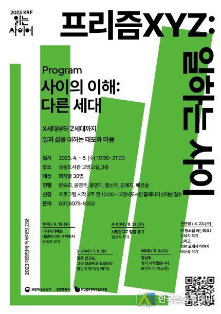삼송도서관은 독서대전 기획 프로그램으로 〈프리즘 XYZ: 일하는 사이〉를 운영하고 있다. 해당 프로그램은 각기 다른 세대의 시선으로 ‘일’이라는 주제를 바라보고 위해 기획됐다. 도서관은 연령대별 저자와의 만남을 네 차례 운영하고 마지막 다섯 번째 시간에 전 연령대를 대상으로 일에 대한 새로운 시선을 가질 수 있는 북토크를 마련했다.