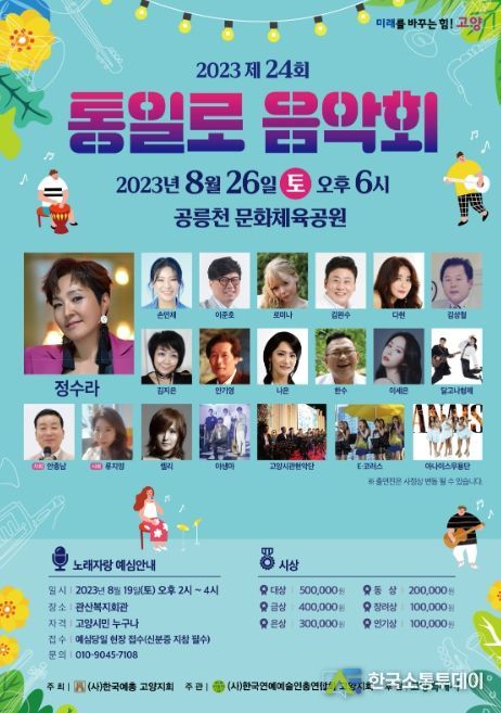 한국소통투데이 관리자 기자 | 오는 8월 26일 고양특례시가 후원하고, (사)한국예술문화단체총연합회 고양지회가 주최, (사)한국연예예술인협회 고양지회에서 주관하는 제24회 ‘통일로 음악회’가 공릉천 문화체육공원에서 열린다.