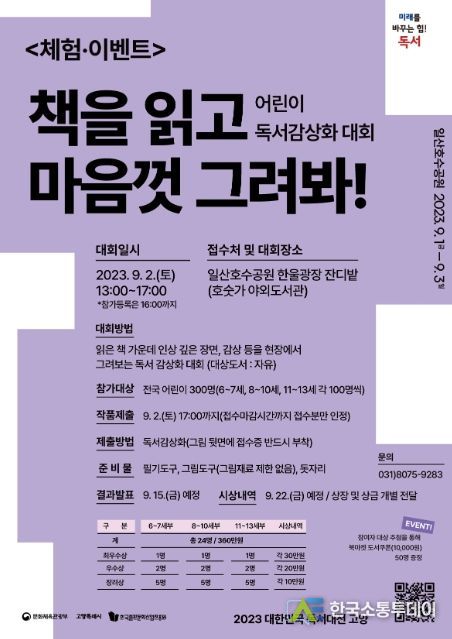대회에는 유아 6~7세 및 초등 1~6학년 어린이라면 누구나 참여 가능하다. 참가 등록은 9월 2일(토) 오후 1시부터 4시까지 일산호수공원 한울광장 잔디밭 ‘호숫가 야외도서관’에서 할 수 있다.