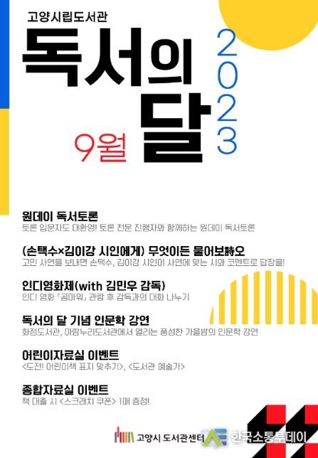 한국소통투데이 관리자 기자 | 독서의 달인 9월을 맞아 고양특례시 곳곳에서 독서 문화 행사가 이어진다. 시는 9월 1일부터 3일까지 일산호수공원에서 열리는 ‘2023 대한민국 독서대전 고양’을 시작으로 관내 20개 시립도서관에서 한 달 내내 책과 함께하는 즐거움을 제공할 예정이다.