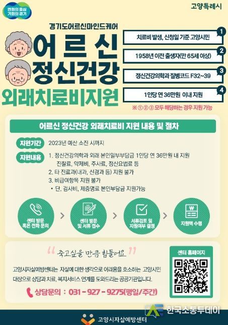 한국소통투데이 관리자 기자 | 고양시자살예방센터가 올해부터 고양시 거주 65세 이상 어르신의 정신건강을 위해 치료비 지원 사업을 시행한다.