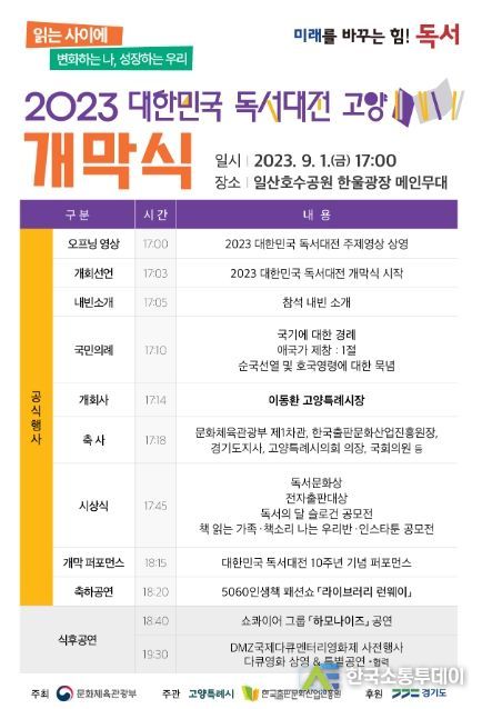 한국소통투데이 관리자 기자 | 국내 최대 독서문화축제인 ‘2023 대한민국 독서대전’이 오는 9월 1일부터 3일까지 사흘간 고양특례시 일산호수공원에서 열린다.
