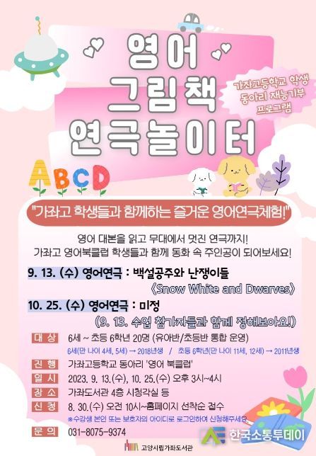한국소통투데이 관리자 기자 | 고양특례시 가좌도서관이 9월 13일부터 10월 25일까지 ‘영어 그림책 연극놀이터’를 운영한다. 해당 프로그램은 가좌고등학교 동아리 ‘영어 북클럽’이 진행한다.