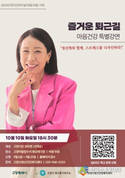 한국소통투데이 관리자 기자 | 고양시정신건강복지센터가 정신건강의 날(10월 10일)을 맞아 방송인 정선희와 함께하는 ‘즐거운 퇴근길, 마음건강 특별강연’을 개최한다.