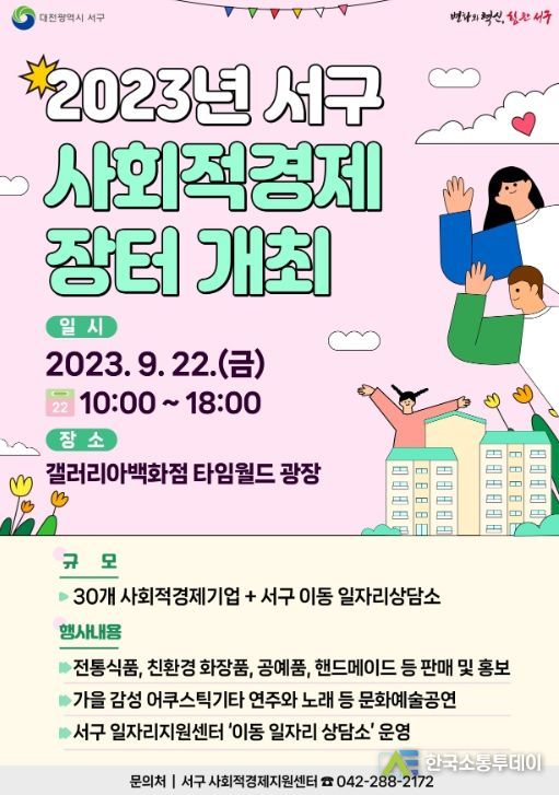 한국소통투데이 관리자 기자 | 대전 서구는 22일 둔산동 한화 갤러리아백화점 타임월드 광장에서 사회적경제기업의 제품 홍보와 판로 확대를 위한 ‘대전 서구 사회적경제 장터’를 개최한다.