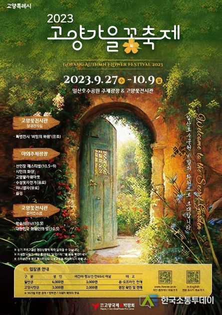 ‘2023 고양가을꽃축제’가 오는 27일부터 10월 9일까지 13일간 일산호수공원 고양꽃전시관과 주제광장 일원에서 열린다. 이번 축제의 메인 주제는 ‘비밀의 화원’으로 실내 공간인 꽃전시관에 1,000㎡의 몰입형 스토리텔링 공간을 조성한다. 또한 고양시에서 생산되는 장미 등 품종별 화훼 작품을 중심으로 화려하고 신비로운 전시가 예정돼 있다.