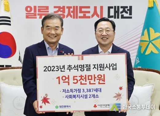 한국소통투데이 관리자 기자 | 대전사회복지공동모금회는 25일 이장우 대전시장을 만나 지역의 어려운 이웃이 따뜻한 추석명절을 나는데 써 달라고 1억 5천만 원을 기탁했다.