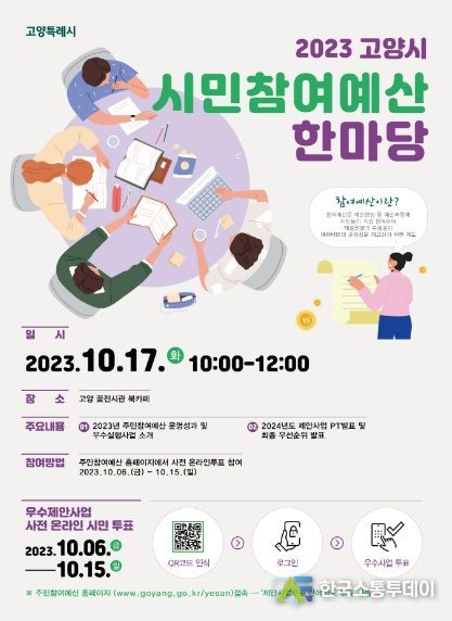 한국소통투데이 관리자 기자 | 고양특례시는 오는 17일 오전 10시부터 ‘고양특례시 시민참여예산 한마당’행사를 일산호수공원 고양꽃전시관(북카페)에서 개최한다.