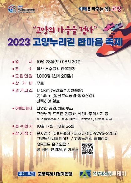 이번 축제는 ‘고양의 가을을 걷다’라는 부제로 열리고, 고양시걷기연맹이 주최·주관, 고양시가 후원한다. 5Km 코스는 일산호수공원을 순환하고, 14Km 코스는 일산호수공원 한울광장~신평초소~평화누리길(한강변)~고양인재교육원~행주수위관측소~진강정~대첩문으로 이뤄진다. 미리 참가자 신청을 받고 있고, 오는 26일까지 고양특례시청 누리집 또는 고양누리길 누리집에서 신청할 수 있다. 또는 문자로 성명, 연락처, 걷기 코스를 전송해 접수하면 된다.