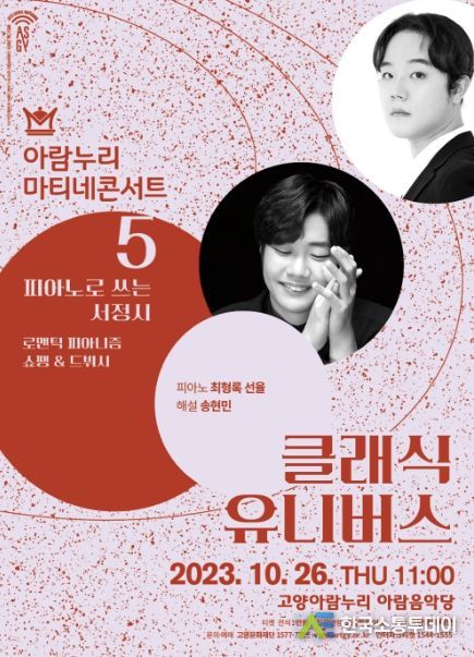 한국소통투데이 관리자 기자 | 고양문화재단은 2023 고양아람누리 마티네콘서트 시리즈 마지막 공연 '클래식 유니버스 5 – 피아노로 쓰는 서정시'를 10월 26일 오전 11시, 고양아람누리 아람음악당에서 선보인다.