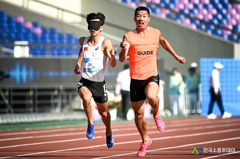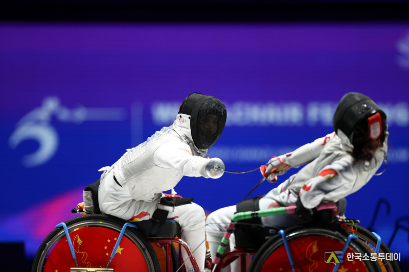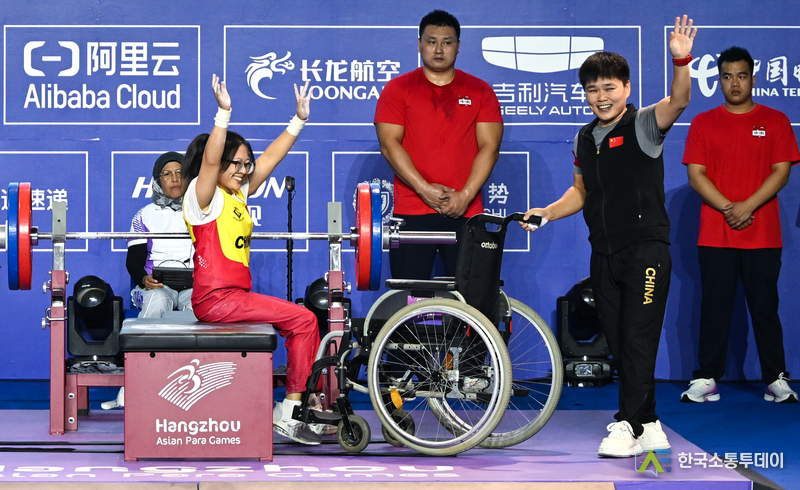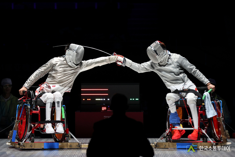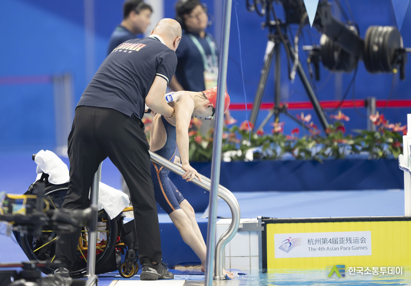 중국의 류위(劉玉) 선수가 24일 코치 리젠후이(李健輝)의 도움을 받아 물 밖으로 나오고 있다. 이날 '제4회 항저우(杭州) 아시안패러게임' 여자 200m 자유형 S5등급 결승전에서 중국의 류위 선수가 2분 55초 51의 기록으로 금메달을 획득하며 대회 신기록을 세웠다. (사진/신화통신)중국 장샤오퉁(張曉彤) 선수의 24일 경기 모습. '제4회 항저우 아시안패러게임' 여자 400m 자유형 S11등급 결승전에서 중국의 장샤오퉁 선수가 이날 5분 04초 48의 기록으로 금메달을 차지하며 해당 종목 아시아 신기록을 경신했다. (사진/신화통신)23일 중국의 펑옌커(馮彥可·왼쪽)와 장제(張傑)가 경기를 치르고 있다. 같은 날 '제4회 항저우 아시안패러게임' 휠체어 펜싱 남자 사브르 개인전 B등급 결승전이 항저우 전자과기대학에서 열렸다. 경기 결과 중국 선수들이 이 종목 1, 2, 3위를 모두 석권했다. (사진/신화통신)중국의 구하이옌(辜海燕) 선수(왼쪽)와 천위안둥(陳遠東) 선수가 23일 결승에서 맞붙었다. 이날 항저우 전자과기대학에서는 '제4회 항저우 아시안패러게임' 플뢰레 여자 플뢰레 개인 A등급 결승전이 열렸다. (사진/신화통신)24일 중국의 추이저(崔哲) 선수가 경기 중 대회 신기록을 세웠다. 같은 날 '제4회 항저우 아시안패러게임' 역도 여자 45㎏급 경기에서 중국의 추이저 선수가 116㎏를 들어 올려 대회 신기록을 세우며 금메달을 거머쥐었다. 인도네시아의 니 넹아 위디아시 선수와 카자흐스탄의 굴림 쿠르만바예바 선수가 뒤이어 2, 3위를 차지했다. (사진/신화통신)중국의 디둥둥(邸東東) 선수(왼쪽)와 가이드 러너 롄자겅(廉佳庚)이 24일 경기 중이다. '제4회 항저우 아시안패러게임' 육상 남자 100m T11등급 결승전에서 중국의 디둥둥 선수가 이날 11초 23의 기록으로 금메달을 획득했다. 중국의 자오핑안(趙平安) 선수와 예타오(葉濤) 선수는 각각 은메달과 동메달을 목에 걸었다. (사진/신화통신)