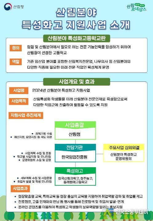 산림분야 특성화고 사업은 목공·임업기계장비 기술과 전문자격증 취득 등 미래 임산업 분야 젊은 인재 양성을 목적으로 추진하고 있으며, 선정된 학교에는 교과과정 개발·운영비, 현장실습비, 연수비, 자격증 취득비 등의 예산을 지원한다.
