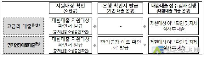 대환대출 취급은행은 대환 대상 대출이 7% 이상 금리인지, 3개월 성실상환 중인지 등 지원조건 충족 여부를 확인한 후 대환대출 지원 시 상환가능성을 심사하여 최종적으로 대출 여부를 결정한다.