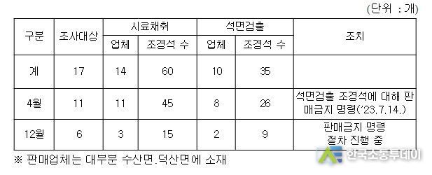 이번 조사는 그간 석면함유 조경석 판매로 문제가 발생한 충북 제천시 지역 내 전체 조경석 판매업체를 대상으로 작년 4월, 12월 두 차례 실시했으며, 석면이 검출된 조경석에 대해서는 판매 금지명령 등 조치를 진행했다.