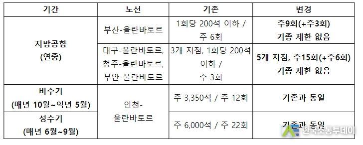 이번 회담을 통해 부산-울란바토르 노선은 운항기종 제한없이 기존 주6회에서 주9회로 늘어난다. 대구·무안·청주 등 기존 3개 노선은 5개 노선으로 확대하고, 운항횟수도 기존 주9회에서 주15회로 증대했다.