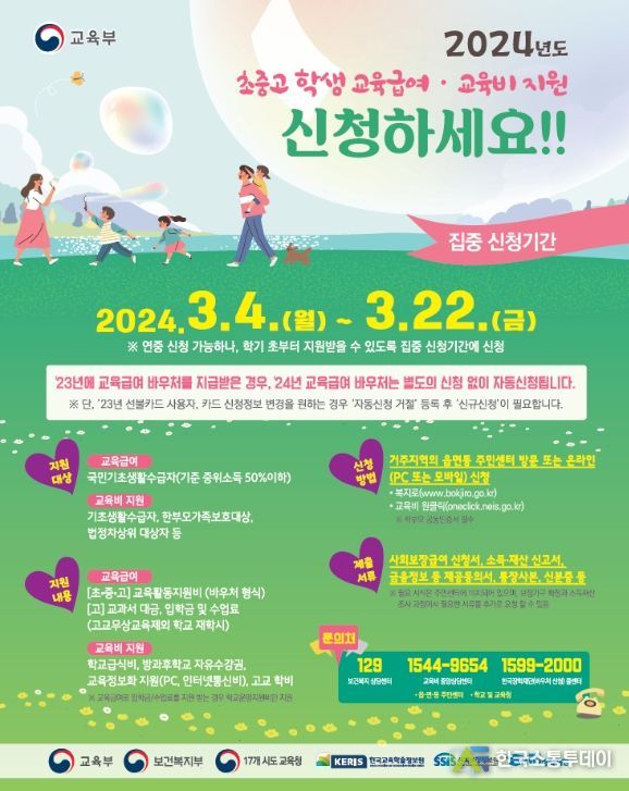 한국소통투데이 관리자 기자 | 교육부는 저소득층 학생의 교육기회 보장과 가구의 교육비 부담 경감을 위해, ‘교육급여’와 ‘교육비’ 지원 집중 신청기간을 3월 4일부터 3월 22일까지 운영한다.