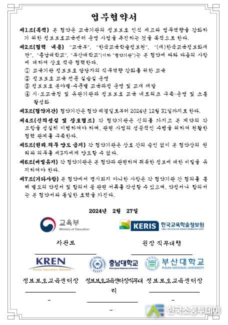 한국소통투데이 관리자 기자 | 교육부와 한국교육학술정보원(원장직무대행 신명호)은 2월 27일, 대구 메리어트호텔에서 (재)한국교육정보화재단, 충남대학교, 부산대학교와 정보보호교육센터 운영을 위한 업무협약을 체결한다.