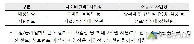 또한 200억원의 예산을 투입하여 수열/공기열히트펌프, LED 조명 등 공사가 필요한 설비를 교체 또는 신규 설치하는 경우 설치비의 70%를 지원할 예정이며, 구체적인 지원조건 및 신청방법 등은 한국에너지공단 누리집을 통해 공고될 예정이다. 관련 사항은 한국에너지공단 수요정책실로 문의하면 된다.