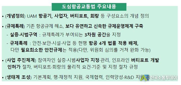 또한, 초기 산업생태계 조성에 필요한 개념정립과 버티포트개발 사업 및 사업자 지정 근거 등 사업추진 체계 마련 등을 위한 내용도 담고 있다.