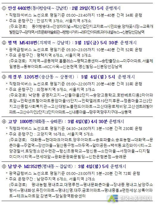 한국소통투데이 관리자 기자 | 국토교통부 대도시권광역교통위원회는 수도권 외곽에서 출발해 서울 주요지역으로 향하는 5개 광역버스 준공영제노선을 2월 29일부터 순차적으로 운행 개시한다고 밝혔다.
