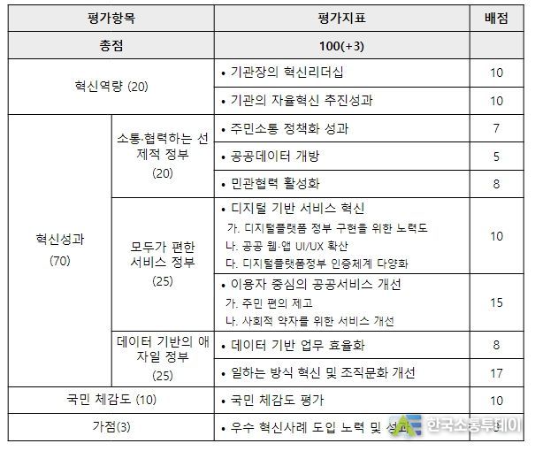 2023년에는 혁신역량, 혁신성과, 국민체감도 등 3개 평가 항목, 10개 세부지표를 대상으로 전문가 등으로 구성된 지방자치단체 혁신평가단이 평가를 실시했다.