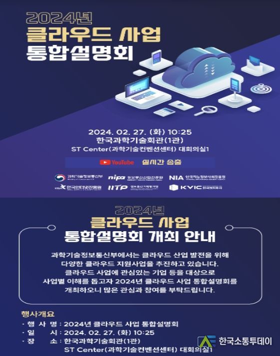 한국소통투데이 관리자 기자 | 과학기술정보통신부는 정보통신산업진흥원(원장 허성욱), 한국지능정보사회진흥원(원장 황종성), 정보통신기획평가원(원장 홍진배), 한국인터넷진흥원(원장 이상중), 한국벤처투자(부대표 신상한)와 함께 2월 27일 과학기술컨벤션센터(서울 강남 역삼)에서 민간・공공 분야 클라우드 관계자를 대상으로 ’24년도 클라우드 지원사업 통합설명회를 개최한다고 밝혔다.