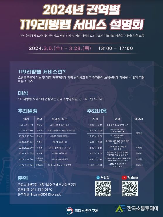 한국소통투데이 관리자 기자 | 국립소방연구원(원장 직무대리 정영태)은 오는 3월 한 달간 소방 관련 기관을 대상으로 2024년도 ‘119리빙랩 서비스’ 설명회를 개최한다.