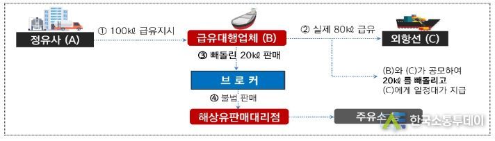 반면, 급유대행업체가 외항선박과 공모하여 정유사로부터 지시받은 해상면세유를 전량 급유하지 않고 일부를 빼돌려 브로커를 통해 해상유판매대리점에게 값싸게 판매하는 등 해상면세유를 불법 유통하고 있다.
