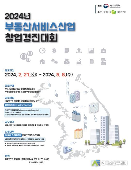한국소통투데이 관리자 기자 | 부동산과 최신 정보기술을 결합한 우수한 아이디어를 발굴하고 부동산서비스 산업 분야 새싹기업을 지원하기 위한 「2024 부동산서비스산업 창업경진대회」가 열린다.