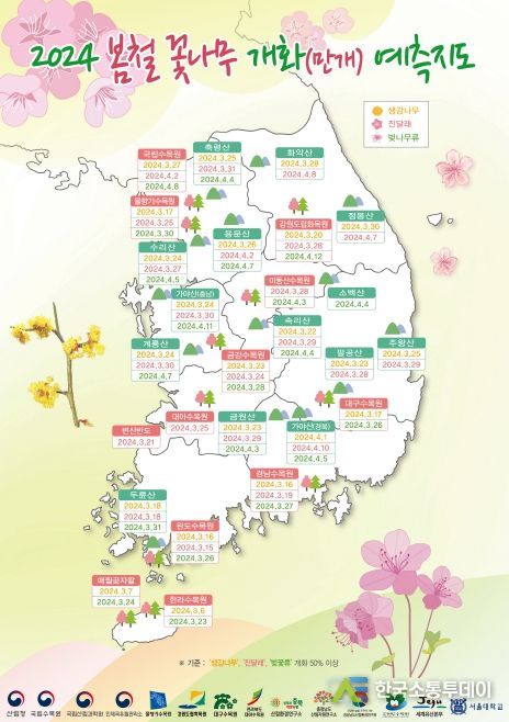 한국소통투데이 관리자 기자 | 산림청은 27일 ‘2024년 봄철 꽃나무 개화 예측지도’를 발표했다. 산림에서 봄소식을 가장 먼저 전하는 생강나무, 진달래, 벚나무류의 꽃 피는 시기는 전년과 비슷할 것으로 예상된다고 밝혔다.