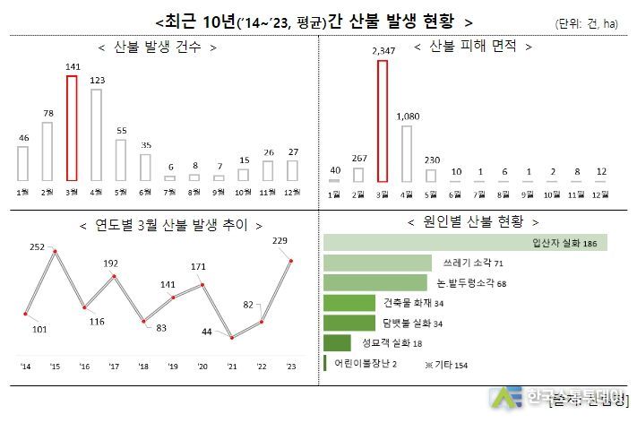 3월에는 연간 산불의 25%인 141건이 발생했고, 피해면적은 절반을 넘어서는 59%(2,347ha)가 불에 타 사라졌다.